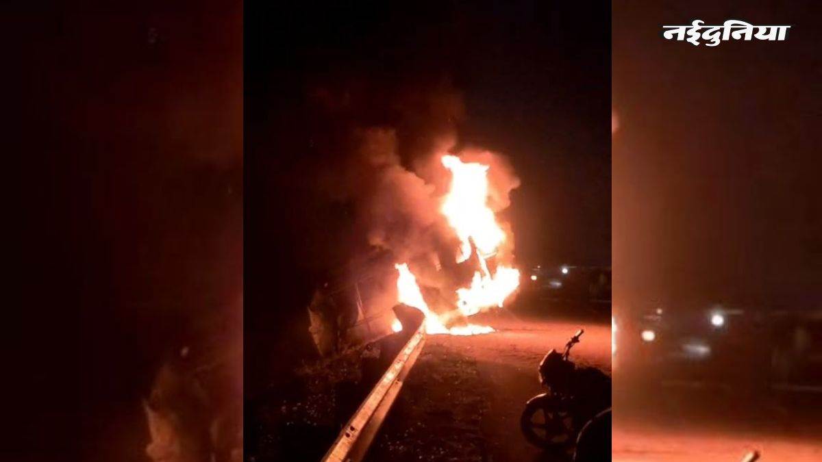 आक्रोशित भीड़ ने श्रद्धालुओं की बस में लगाई आग।HighLights